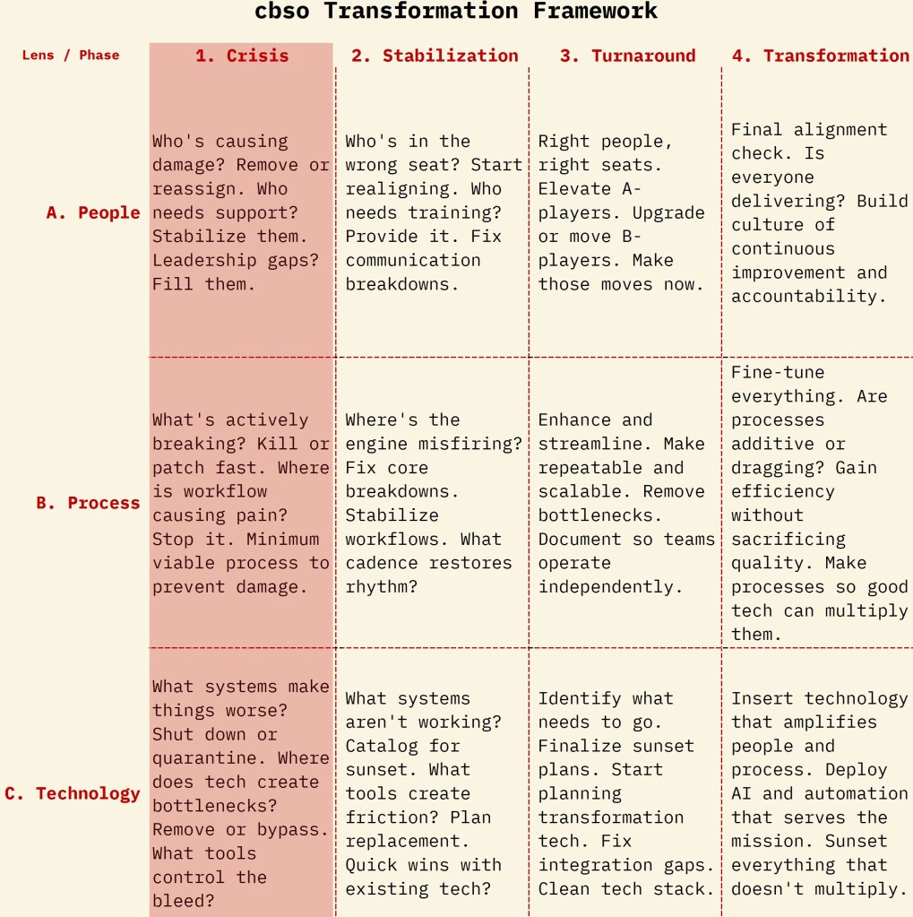 Crisis mitigation is damage control. You remove or reassign people actively causing harm. You kill or patch processes that are breaking the business. You shut down or bypass systems making things worse.