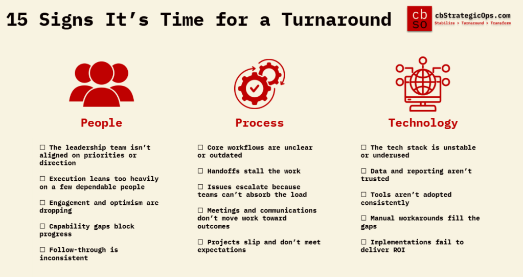 The CFO shouldn’t be the one breaking the news that it’s time for change. I use this list as a reality check… a way to name and spot the yellow and red flags you and your team have been living with or managing around. When enough of these show up across people, process, and technology, the operation needs stabilization and a turnaround. And those moves set the stage for a full transformation.