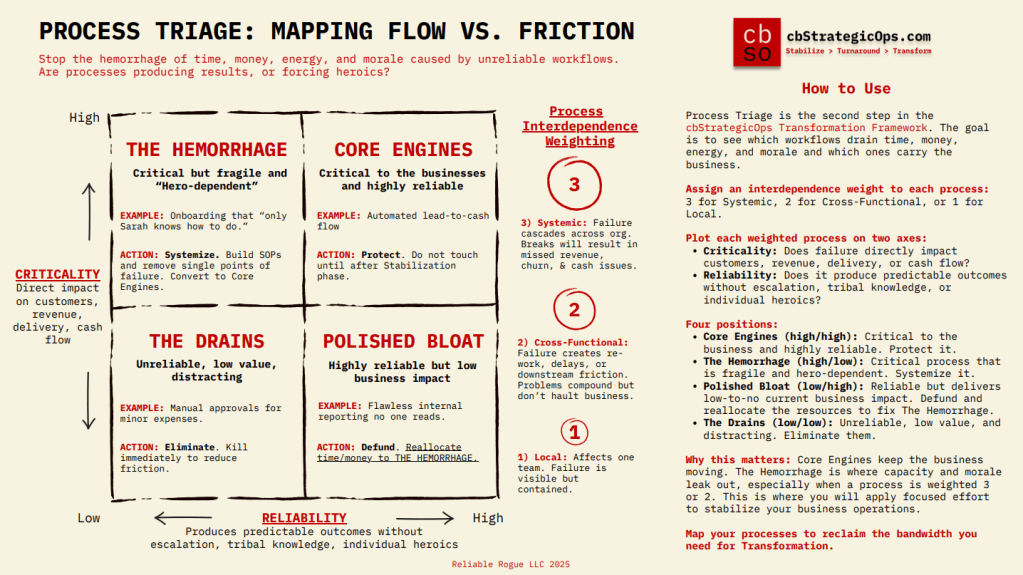 This is the point where leaders usually get uncomfortable, because the map makes it obvious which workflows are carrying the business, which ones are bleeding it, and which failures have the biggest blast radius when they break. This matrix is the tool I use to show that clearly.